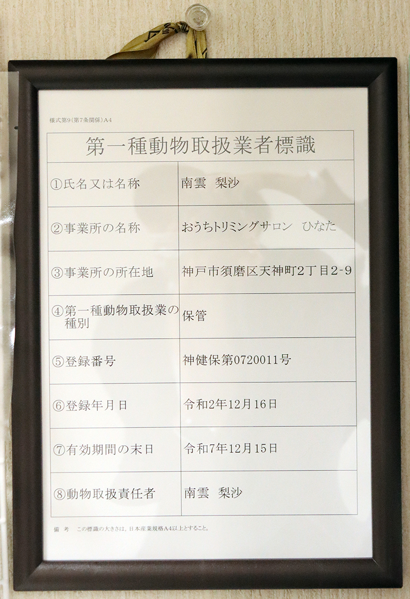 | 動物取扱業登録証 | 第一種動物取扱業登録 第0720011号 第一種動物保管業種別 保管 動物取扱責任者 南雲梨沙 |